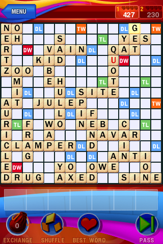 I can't help it. I play it whenever I get 5 minutes of downtime; social gatherings not requiring constant attention, 15 minute breaks, before bed, etc. I find myself dreaming about it and constantly on the look out for new words that would make madd points. It's gotten to the point where I NEVER lose to the computer. EVER. I wanna start playing people wayyy better than I am so I can really own mofoz. I might get geeky on em and enter a local competition or something. UGH! SCRABBLE YOU HAVE CONSUMED ME!
