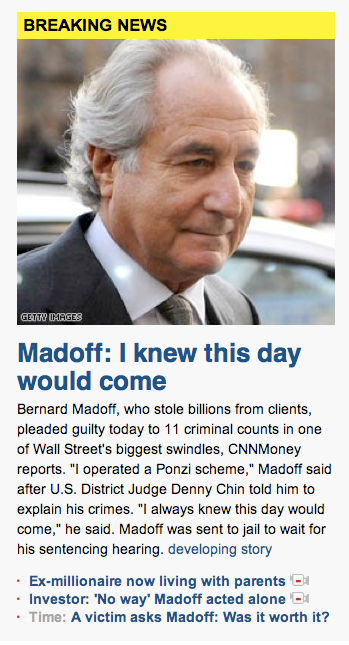 Bernie Madoff straight up pled guilty this morning to 11 felony counts against him, including money laundering, fraud and perjury. The sentence? There's talk of 150 years! Ouch.. get the Vaseline...